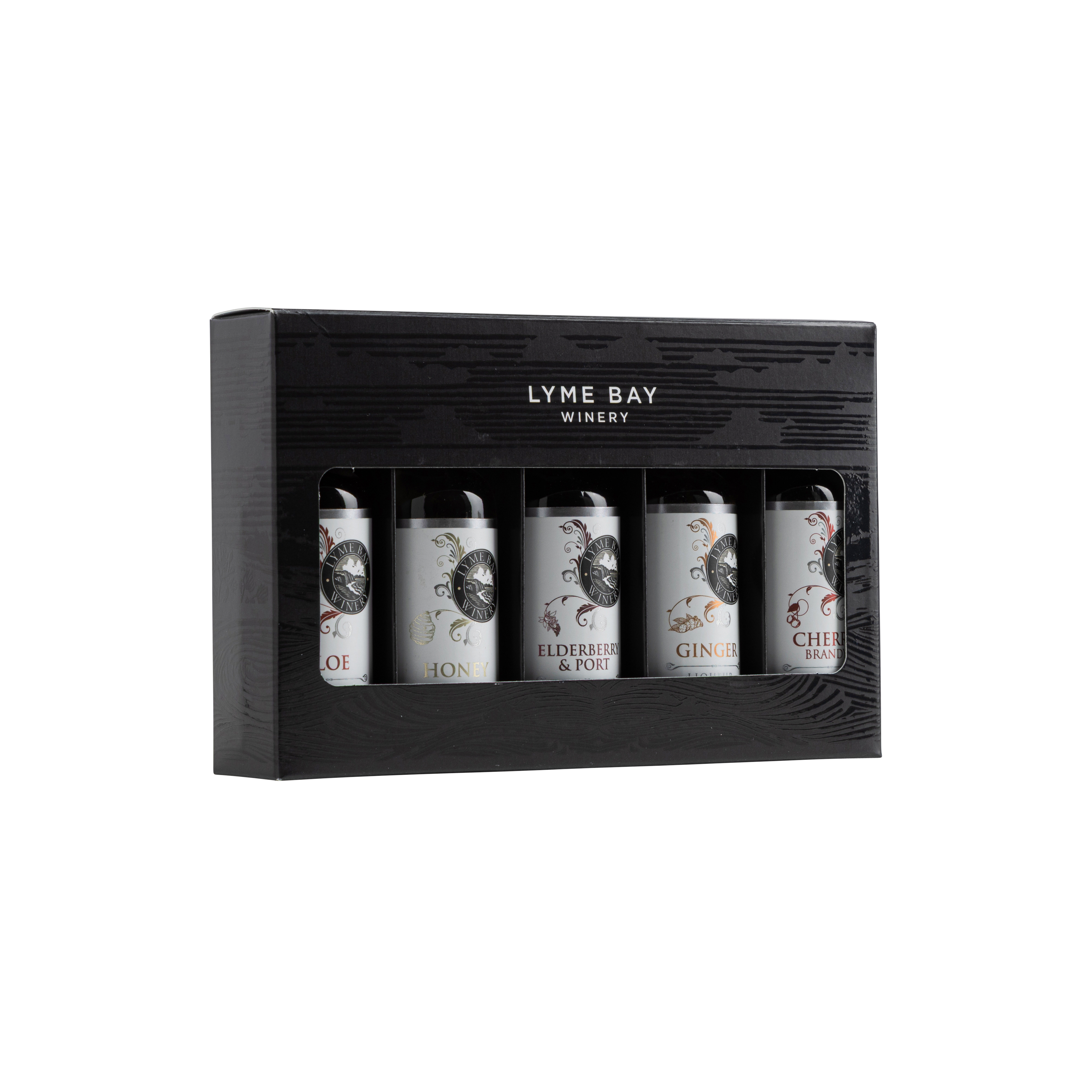 An attractive miniature gift box containing our winemaker’s choice of five best-selling fruit liqueurs. Sloe Liqueur, Honey Liqueur, Elderberry & Port, Ginger Liqueur & Cherry Brandy in 5cl bottles.